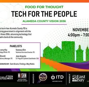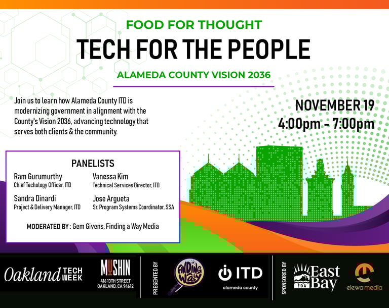 Find a Way Media is hosting an event at the Oakland Tech Week titled Food for Thought: Tech for the People, a panel discussion featuring the Alameda County IT department.
